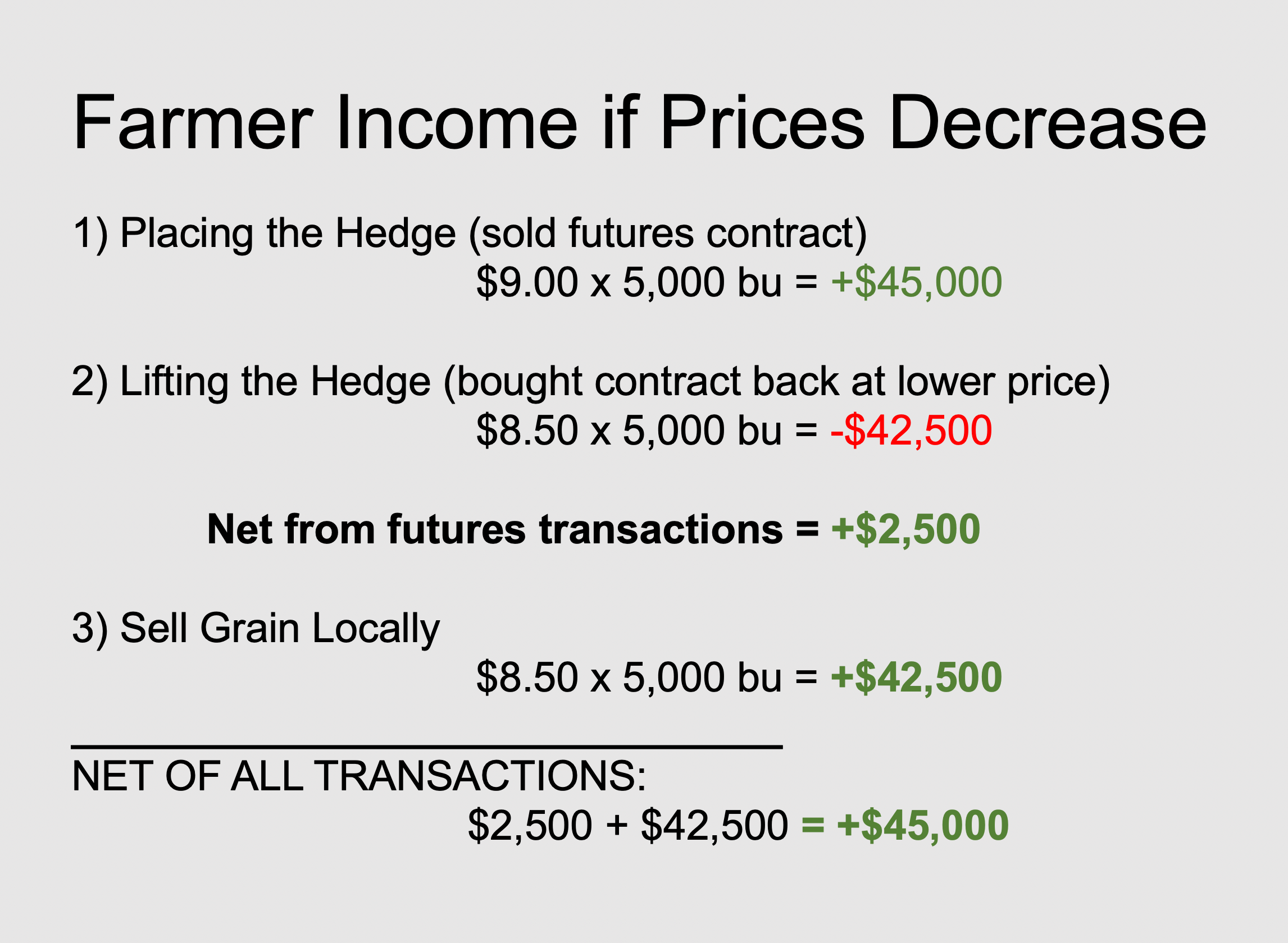 For example, if prices decline 50 cents per bushel between when the farmer placed the hedge and when they lifted the hedge, they profit 50 cents from the futures transactions but receive a price for the physical grain that is 50 cents per bushel lower than at the time the hedge was placed: