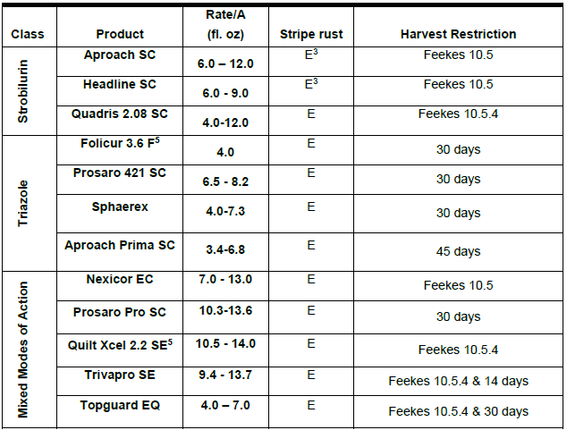 When choosing a fungicide, pay close attention to harvest restrictions on the label. Table 1 is abbreviated from NCERA 184 Fungicide Efficacy for Control of Wheat Diseases to include only fungicide products with an excellent stripe rust rating. The fungicides Prosaro and Folicur provide excellent protection against a stripe rust epidemic. Generic versions of the same active ingredient will provide equivalent control. These fungicides have a 30-day pre-harvest restriction so use caution when applying to fields nearing harvest. Stobilurin-only products such as Aproach and Headline are less effective when used alone after a stripe rust infection has occurred. Aproach Prima also provides excellent protection against stripe rust; however, this fungicide has a 45-day pre-harvest restriction and should only be applied to varieties that are still in boot and not yet heading. As a reminder, Feekes 10.5 is heads fully emerged from the boot and Feekes 10.5.1 to 10.5.4 is the flowering stage.