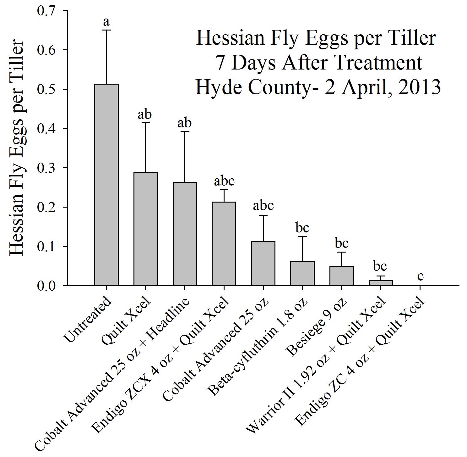 Note: Quilt Xcel and Headline are fungicides with no activity on Hessian fly. Endigo ZC is lambda-cyhalothrin + thiamethoxam, Warrior II (Karate Z) is lambda-cyhalothrin, Baythroid XL is beta-cyfluthrin, Tombstone is cyfluthrin (active on Hessian fly), and Cobalt Advanced is lamda-cyhalothrin + chlorpyrifos and is no longer available or labeled on wheat.